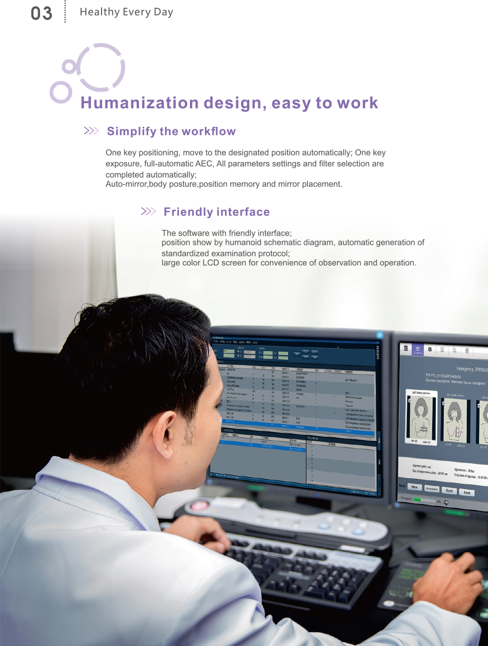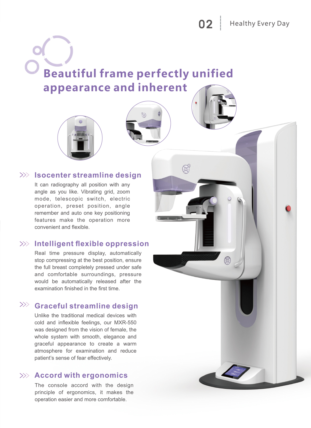 Unlike the traditional medical devices with cold and inflexible feelings, our MXR-550 was designed from the vision of female, the whole system with smooth, elegance and graceful appearance to create a warm atmosphere for examination and reduce patient's sense of fear effectively