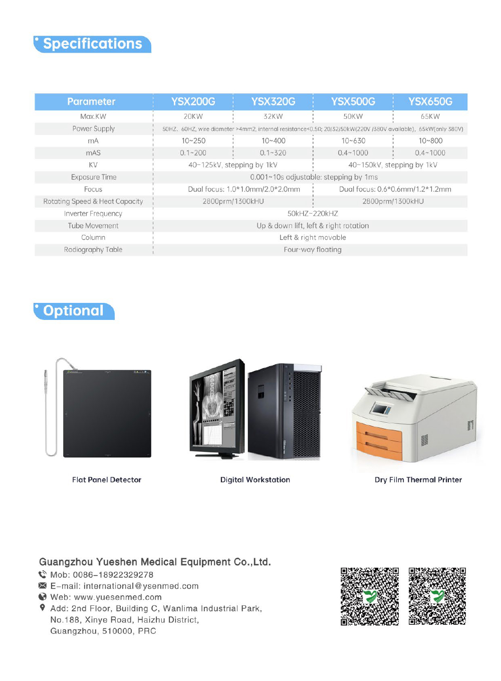 YSENMED YSX650G (YSF65-B3) 65kW 800mA Medical Digital X ray System